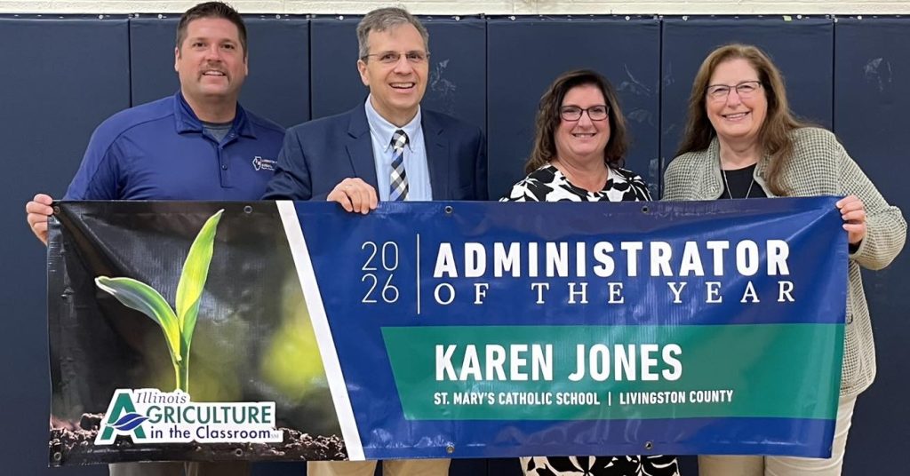 Congratulations to the 2026 Illinois Agriculture in the Classroom Administrator of the Year, Karen Jones. Karen is the Principal at St. Mary’s School in Pontiac. This is a tremendous and well-earned honor! Pictured left to right are: Chris Bunting (Livingston CFB), Kevin Daugherty (IAITC), Karen Jones, and Debbie Ruff (Livingston SWCD/AITC). More information here: Facebook
