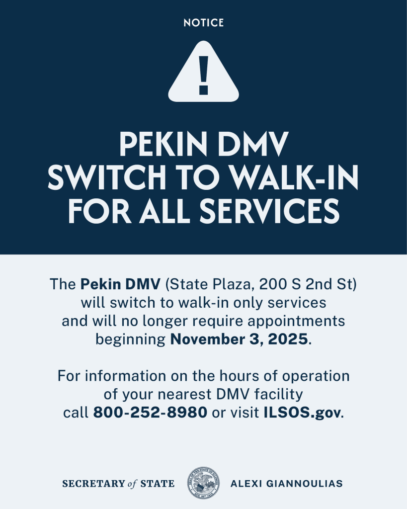 The Pekin DMV is switching to walk-in services, and customers will no longer require appointments. For more information on the hours and services offered at this facility, please visit this link: https://apps.ilsos.gov/facilityfinder/facilityfinder…