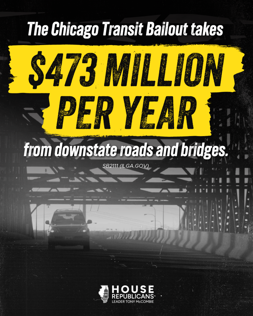 SB 2111 breaks the longstanding transportation funding deal that was a 55/45 Downstate/Chicago split. The Democrats’ Mass Transit Bailout sweeps nearly $500 million from Downstate road funding, resulting in an 85/15 Chicago/Downstate split.
