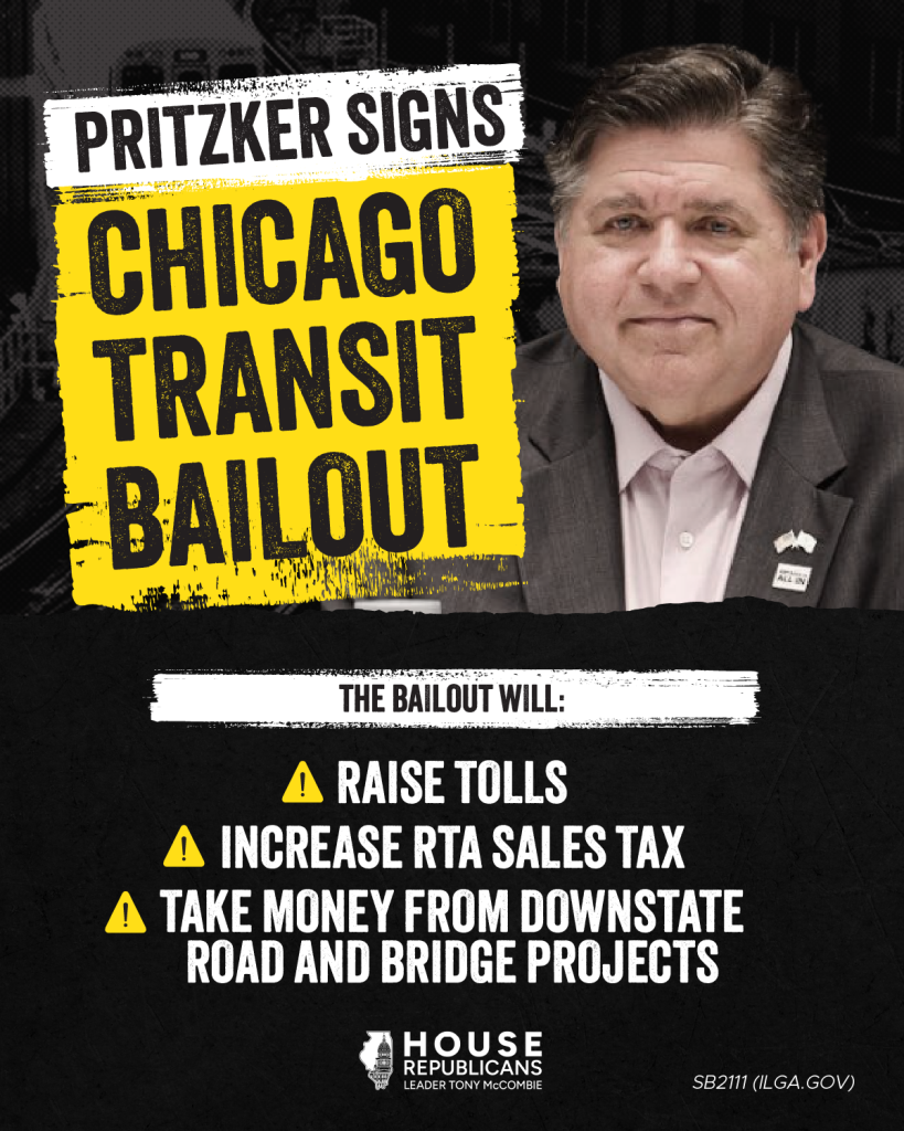 Earlier this week, Governor Pritzker signed the Chicago transit bailout and stuck Illinoisans with the tab. This law will raise tolls, hike the RTA sales tax, and take money from downstate road and bridge projects to fund Chicago’s mismanaged transit system. The people of Illinois deserve better.