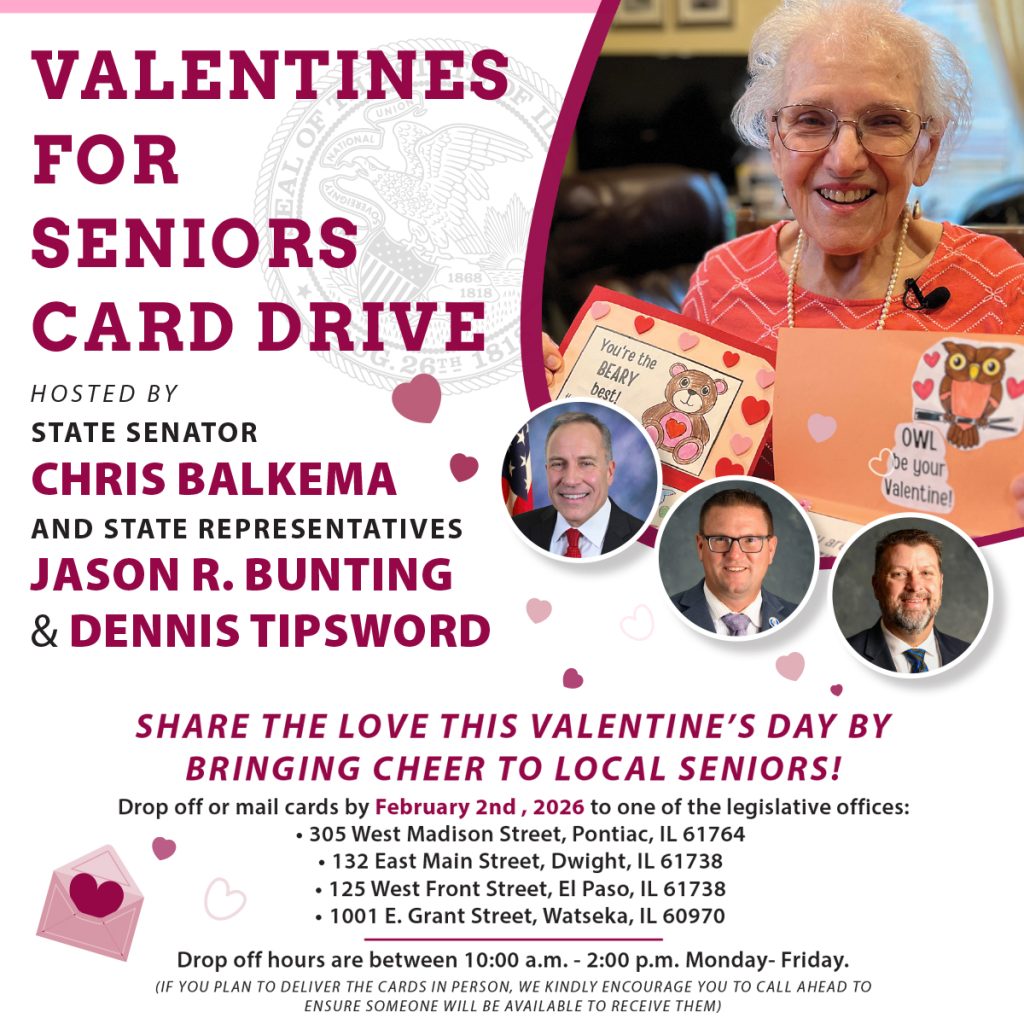 My office is co-hosting a Valentines for Seniors Card Drive, with the deadline for submissions on February 2. Please consider bringing Valentine’s Day cheer to our local seniors! Cards can be dropped off or mailed to one of our legislative offices listed above. Thank you in advance for your support and for helping to bring kindness and smiles to our communities!