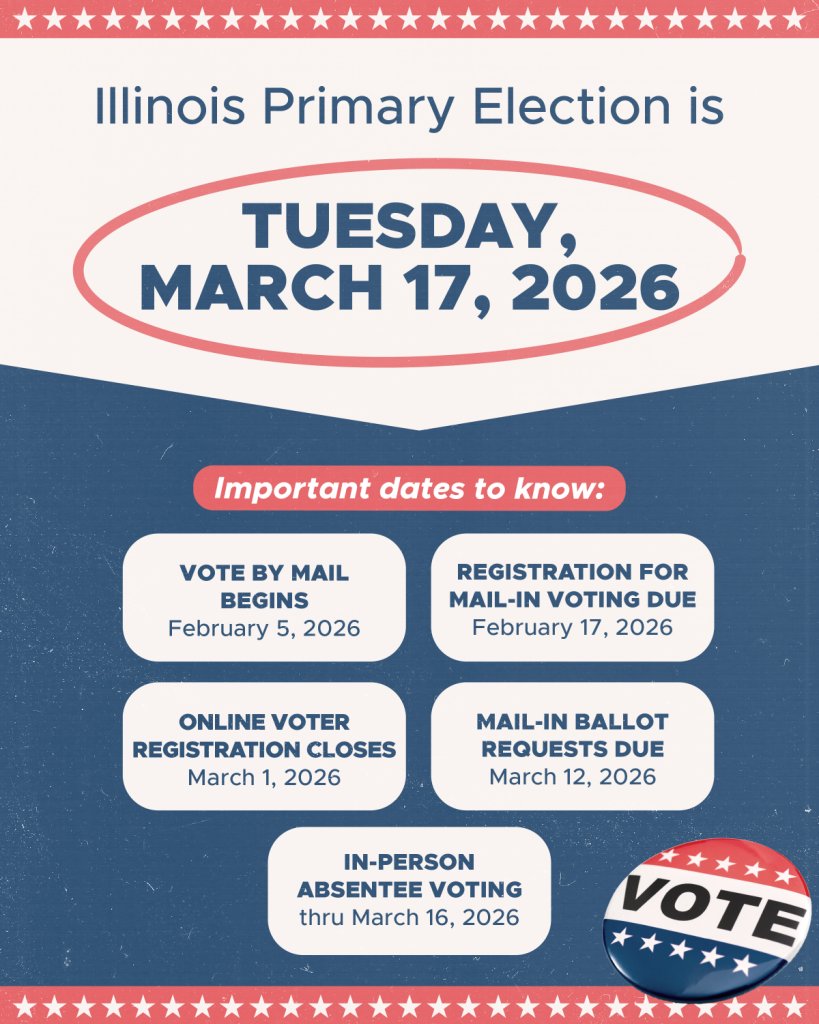 The Illinois Primary Election is Tuesday, March 17, 2026. Make sure you plan ahead to take advantage of the voting option that works best for you.