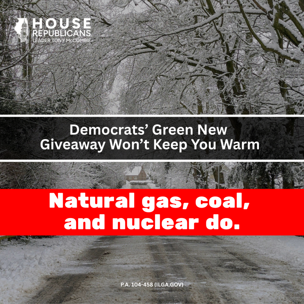 The brutal cold and winter storms we’ve seen across Illinois serve as an important reminder that energy reliability is crucial for our state. Democrats’ “green” energy policies put us at risk of energy shortages while raising costs even higher for Illinois families who are just trying to keep their lights on and their homes warm. Illinoisans need affordable energy they can count on. House Republicans support a comprehensive approach to energy that includes reliable natural gas, coal, and nuclear.