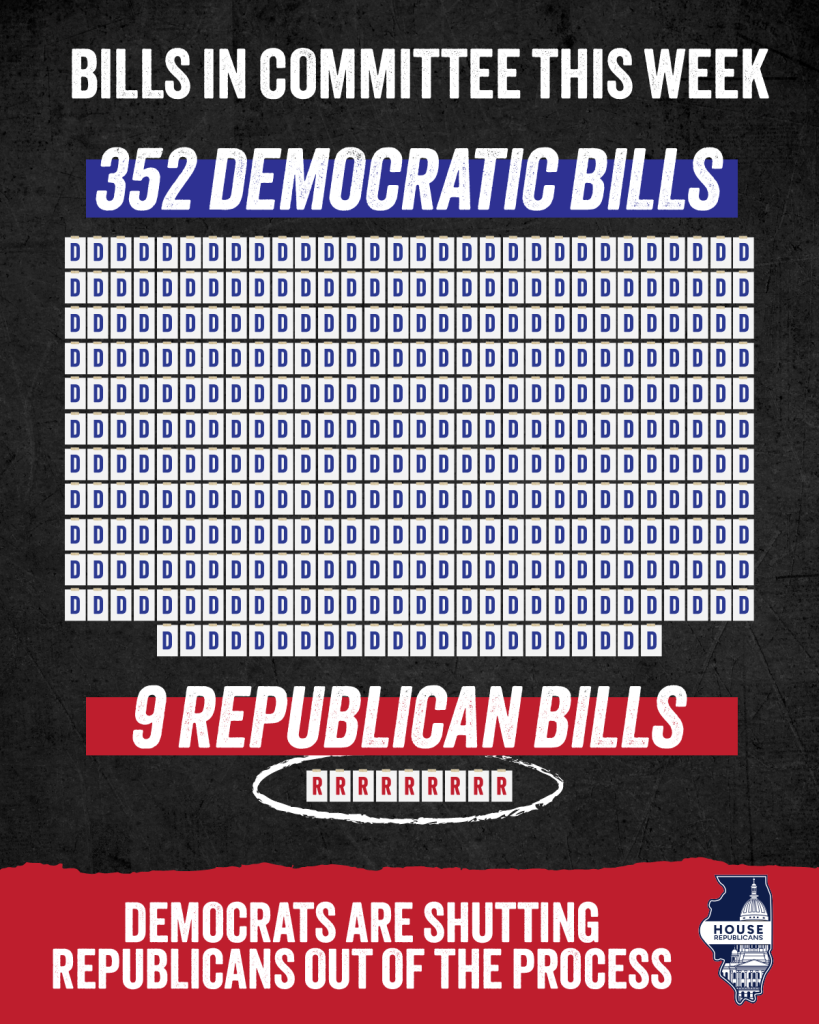 This week, there were 352 bills from Democrats in committee vs. just 9 from Republican lawmakers. Democrats are abusing their supermajority status to shut Republicans and the millions of Illinoisans we represent out of the process.